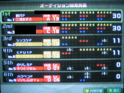 たぶん仕事に集中してて時間は流れていく→でもやりたい事が出来てないみたいなw まぁ明日は流石にお休みなので今日明日思いっきり遊び倒しますよ!! さて、あずささんですけど、47週くらいまで来ました。 ファン人数も150万突破でSランクになりましたよ^^ そして流石土曜日の夜、今夜は帰らないで対人数回w 一番ドキドキしたのはこれ。 満点フレッシュ勝ち^^; ランク見たらこっちのほうが高かったし週の長さこっちのほうが上かなぁって思ってたんですが、オーデ中に自分の方が上に表示されてたのでフレッシュ負けは無いと確信。 こういうドキドキ感があるからオンラインは面白いですねw まぁアケ版のドキドキに比べたら月とすっぽんですけど・・・