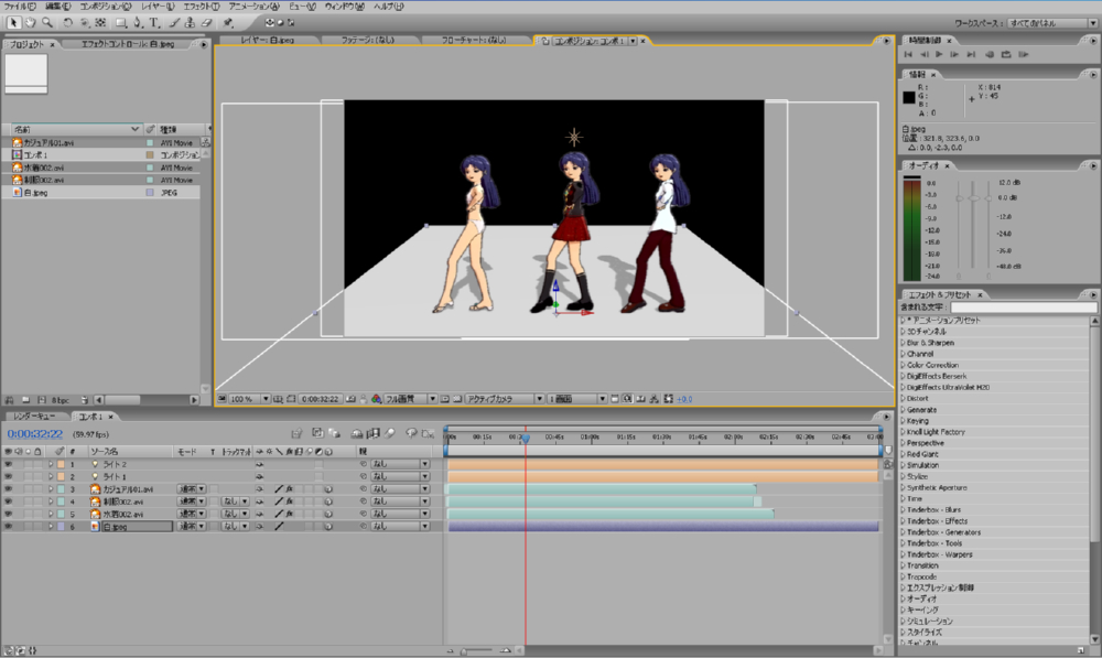 どうやら影を写す床部分を3D処理してなかったみたいです。 ググって勉強してたときに3D化するのは分かってたんですが、軸処理ではなくただ幅を狭めただけという3D意味なし的なことをして勘違いしてたみたいw まぁこれで最低限の影はつけれるかもね。 問題は前後移動の際に床も一緒に処理しないといけない点。 キャラと一緒に移動させればいいと思うんだけど・・・・重い・・・・・・・ PCスペック的にはボチボチだと思うんだけどなぁ>< ていうかこんなことしてる暇がないんですよね。 次回作早く目処つけないと・・・・大変なことになる・・・・・・・ そういえば抜き検証してて思ったんだけど、ちひゃって足長いよね。 水着でブルーバックだとすごい長く感じる。 グラビアだと長く感じるけどスク水だとなんか太って見える・・・ ・・・・・ブルーバックって体のラインがすごい強調されるから・・・ある意味・・・・ハァハァ映像?w PR 久々に作った動画の内容とか説明してみようかと思います。